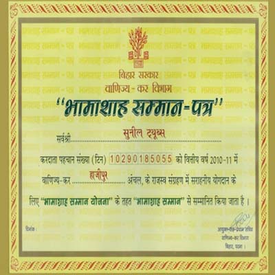 This award has been constituted by Sales Tax Department, Govt. of Bihar for growth in Sales Tax, Timely Payment & No Fine/ Penalty. We have won two years in a row i.e. for F/Y 2010-11 & 2011-12.