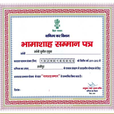 This award has been constituted by Sales Tax Department, Govt. of Bihar for growth in Sales Tax, Timely Payment & No Fine/ Penalty. We have won two years in a row i.e. for F/Y 2010-11 & 2011-12.